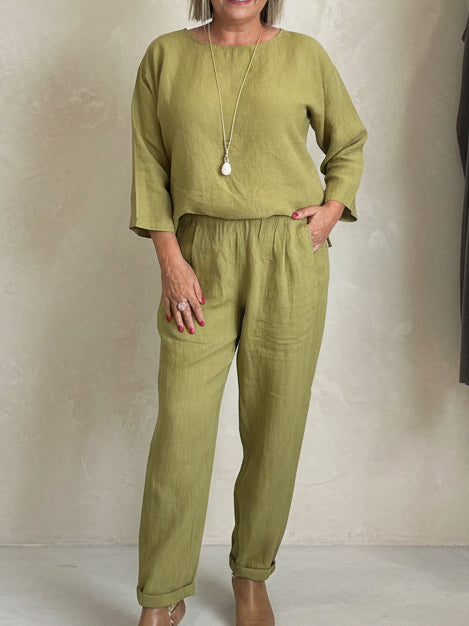 Bluzka lniana damska i komplet z prostymi nogawkami