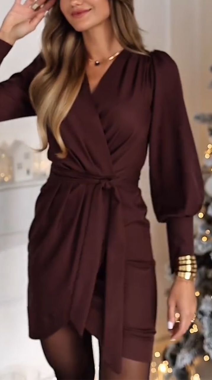 Sukienka damska z dekoltem w serek i paskiem w talii w jednolitym kolorze, elegancka, dopasowana do sylwetki