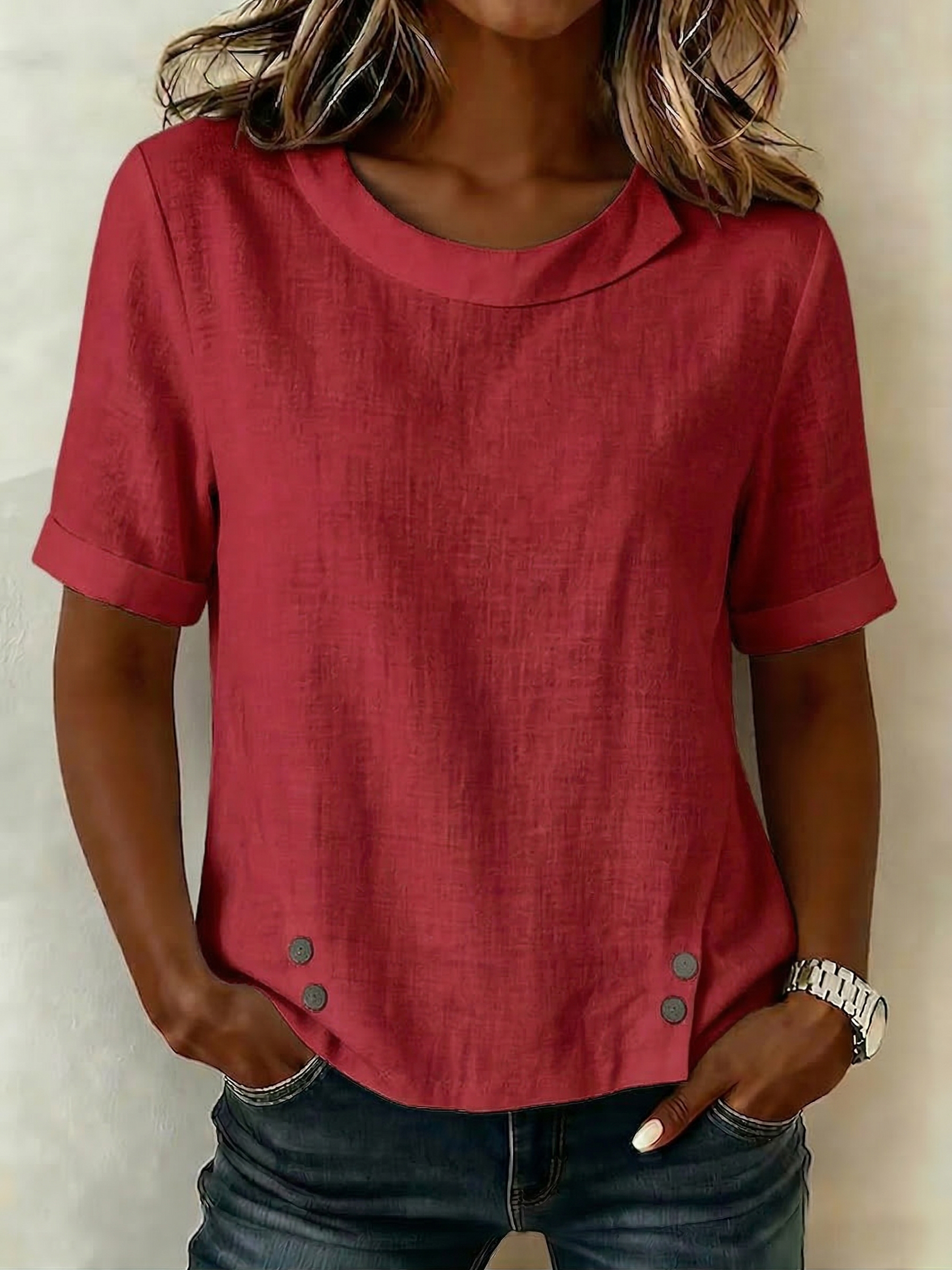 Wygodna bluzka damska w stylu retro z okrągłym dekoltem z bawełny i lnu
